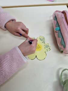 Le portrait et les grandes étapes de la vie de Mère Teresa ont été abordés. A la suite de ce temps, chaque élève a réalisé une fleur en y notant les bonnes actions pour suivre le chemin des Saints.