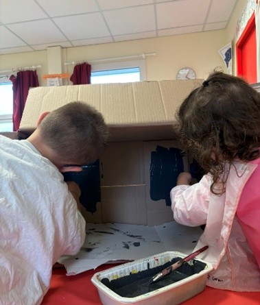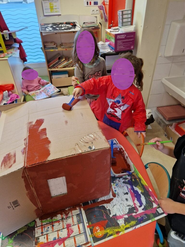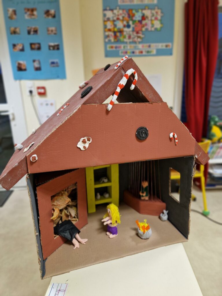 La classe de GS-CP a travaillé sur un projet artistique autour du conte Hansel et Gretel. Les élèves ont réalisé une boîte représentant l’épisode où Hansel est emprisonné par la sorcière et où Gretel la pousse dans le four.